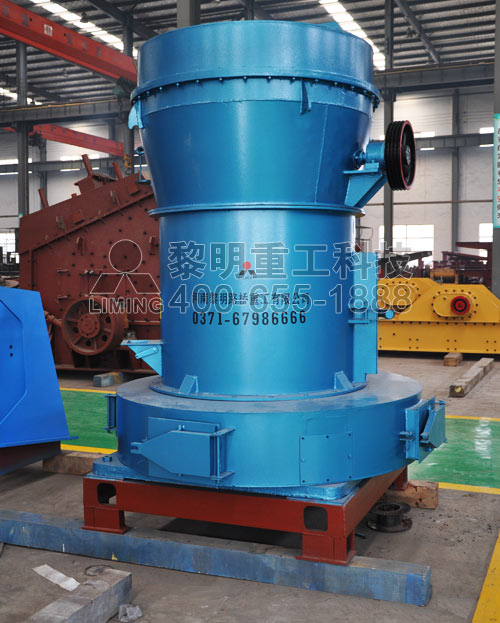 在工作過程中物料經粉碎到所需粒度后,由提升機將物料送至儲料斗,再經振動給料機將料均勻連續的送入主機磨室內,由于旋轉時離心力作用,磨輥向外擺動,緊壓于磨環,鏟刀鏟起物料送到磨輥與磨環之間,因磨輥的滾動而達到粉碎目的。物料研磨后的細粉隨鼓風機的循環風被帶入分析機進行分選,細度過粗的物料落回重磨,合格細粉則隨氣流進入成品旋風集粉器,經出粉管排出,即為成品。