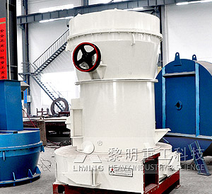 大塊狀物料經(jīng)顎式破碎機(jī)破碎到所需要粒度后,由提升機(jī)將物料送至儲(chǔ)料斗,再經(jīng)振動(dòng)給料機(jī)均勻定量連續(xù)地送入主機(jī)磨室內(nèi)進(jìn)行研磨。粉磨后的粉子被風(fēng)機(jī)氣流帶走,經(jīng)分析機(jī)分級,符合細(xì)度的粉子隨氣流經(jīng)管道進(jìn)入大旋風(fēng)收集器內(nèi),進(jìn)行分離收集,再經(jīng)粉管排出成品粉子。