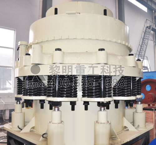 工作時,在動錐靠攏定錐的區段,物料受到動錐的擠壓、撞擊和彎曲作用,成為破碎腔;在動錐偏離定錐的地方,已被破碎的物料在自重作用下從錐底卸出,成為卸料口。電機通過液力偶合器、小圓錐齒輪驅動偏心套底部的大圓錐齒輪,使偏心套旋轉,致使錐體作旋擺動而破碎物料。