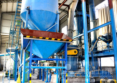 當方解石進入磨腔后,由鏟刀鏟起送入磨輥與磨環之間進行碾壓,碾壓后的方解石粉隨鼓風機的循環風帶入分析機,合格細粉隨氣流進入旋風集粉器收集即為成品,大顆粒物粒落回重磨。循環風返回鼓風機再重復以上過程,余風則進入袋式除塵器凈化。當磨輥與磨環達到一定磨損后,調整高壓彈簧長度,保持磨輥與磨環之間恒定碾壓力。從而保證方解石穩定的產量與細度。