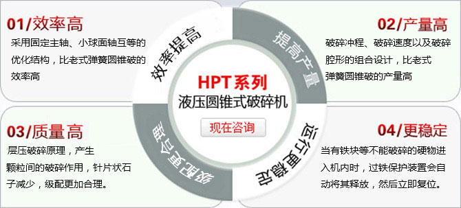 1、HPT是新型的液壓圓錐破碎機,運行更安全穩定,檢修方便、停機時間短,產量有保障,更適合應用于大型砂石生產系統中。