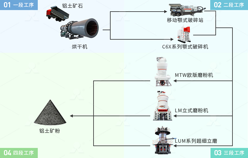 鋁土礦石加工生產工藝主要包括:煅燒、破碎、粉磨、成品包裝四個階段。