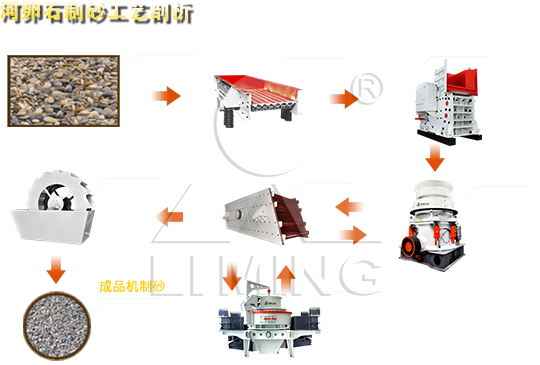 合理的河卵石制砂工藝,在考慮破碎項目投資成本的同時,也不能忽略生產線的生產成本。考慮到河卵石的高硬度必然對顎板、板錘、反擊板等耐磨件造成高損耗,因而在工藝設計上,我們推薦選用層壓原理的破碎設備,以降低耐磨件的損耗。典型的層壓設備配置是兩級顎破或顎破加圓錐破。如果客戶對石料粒型有較高的要求,我們建議配置一臺制砂機進行整形破碎,這樣就形成了三段破碎的工藝配置。三段破碎必然導致項目的投資成本升高,但對于長期運營的制 砂廠來說,三段破碎對生產成本的降低是十分可觀的。