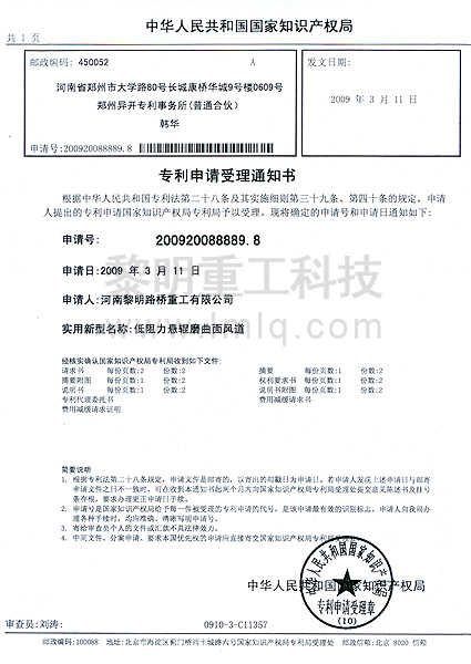 - 低阻力懸輥磨曲面風道專利號:200920088889.8  >>查看證書